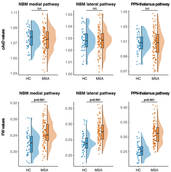 1. MSA患者三条通路自由水分数(FWf)均显著升高,提示细胞外水增加与神经炎症/变性相关;